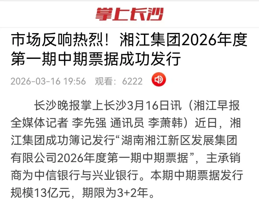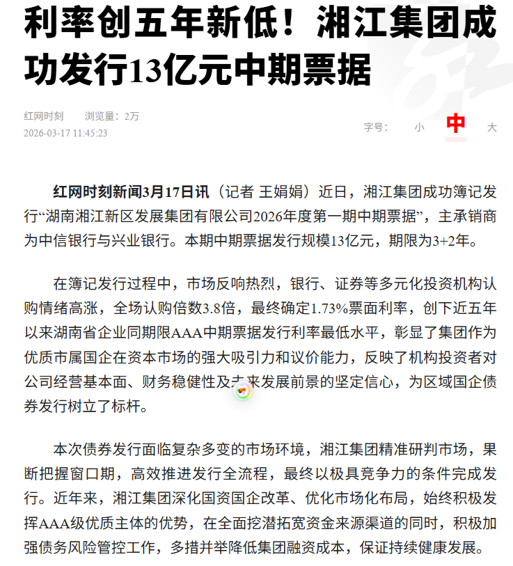 近日,湘江集團成功簿記發(fā)行“湖南湘江新區(qū)發(fā)展集團有限公司2026年度第一期中期票據(jù)”,主承銷商為中信銀行與興業(yè)銀行。本期中期票據(jù)發(fā)行規(guī)模13億元,期限為3+2年。紅網(wǎng)、湘江早報等多家媒體關(guān)注報道。
